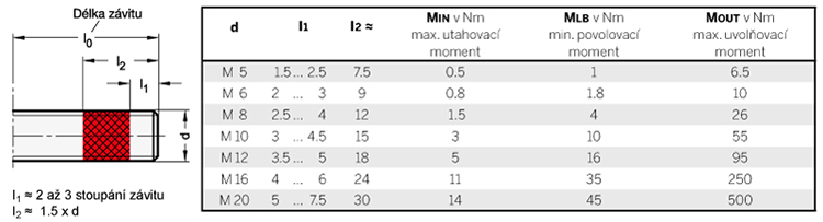 Hodnota utahovacího momentu odpovídá DIN 267 část 27. Vychází ze zkoušek závitů bez předchozího zatížení se vnitřní závitovkou 6H a za pokojové teploty. Pro závity délek l0 < l2, l2 je snížena tak, aby jedna až dvě otáčky nebyly na konci závitu zakryté.