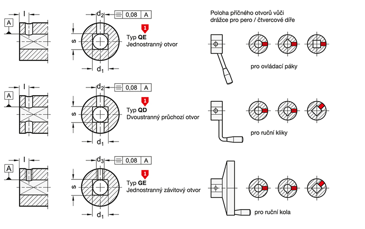 Nejen že naše komponenty s příčným vrtáním (GN 110) nabízíme za příznivou cenu, srovnatelnou s konkurencí, ale také touto variantou šetříme nadbytečnou práci na výkresech. Geometrický tvar některých provozních prvků však neumožňuje úpravy podle této konkrétní normy GN.