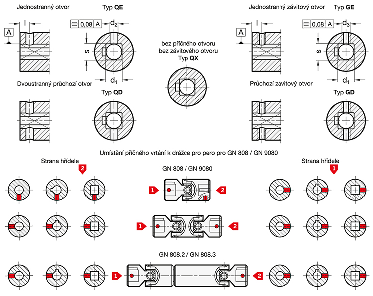 Pozice příčných vrtání / závitových otvorů s referencí na drážku pera náboje /plocha nebo univerzální kloub jsou vyobrazeny v celkovém pohybu.