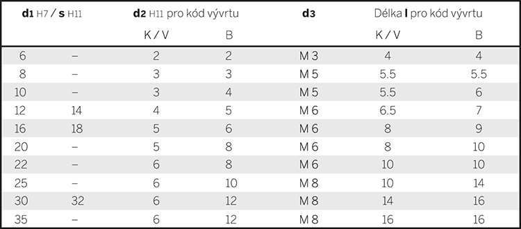 Vývrty čepů d2 s tolerancí H11 jsou určeny pro použití s vinutými pružnými kolíky.
