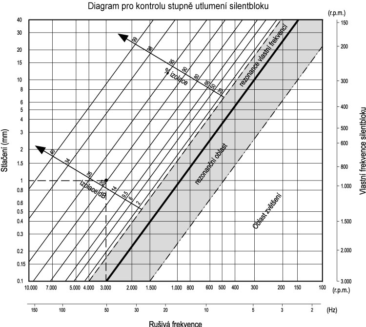 - na diagramu pro kontrolu stupně izolace protněte hodnotu rušivé frekvence s požadovaným stupněm izolace (každý stupeň izolace odpovídá nějaké lince na diagramu) a definujte stlačení [mm]