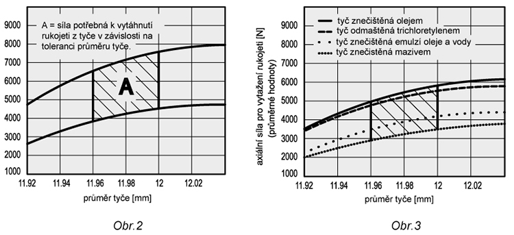Graf na obr. 2 zobrazuje proměny v osní translaci vyjádřené v [N] jako funkci proměn průměru hřídele (mm), za sucha po odmaštění trichlorethylenem. Křivky představují minimální a maximální hodnoty ve stovkách zkoušek, provedených na typu samosvorného madla s otvorem o prům. 12 mm. Plocha A obsahuje hodnoty pro hřídel s komerčním průměrem 12 mm (tol. h9).