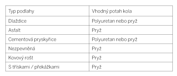 Hlavní kombinace podlahových krytin a příslušných kol jsou uvedeny v následující tabulce.