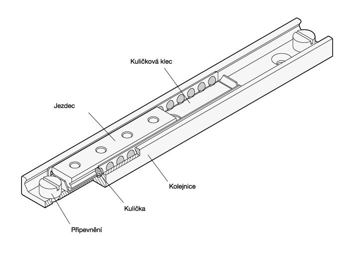 Všechny lineární vedení sestávají z vnější kolejnice s běhounem pohybujícím se uvnitř. Kuličky z ložiskové oceli, které jsou držena ve vzdálenosti a poloze pomocí kuličkové klece, leží mezi kolejnicí a běžcem.