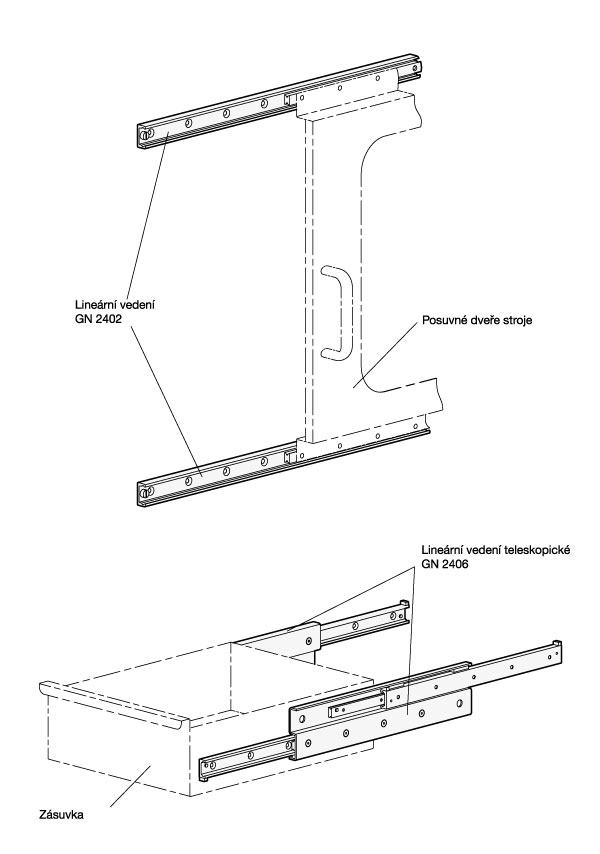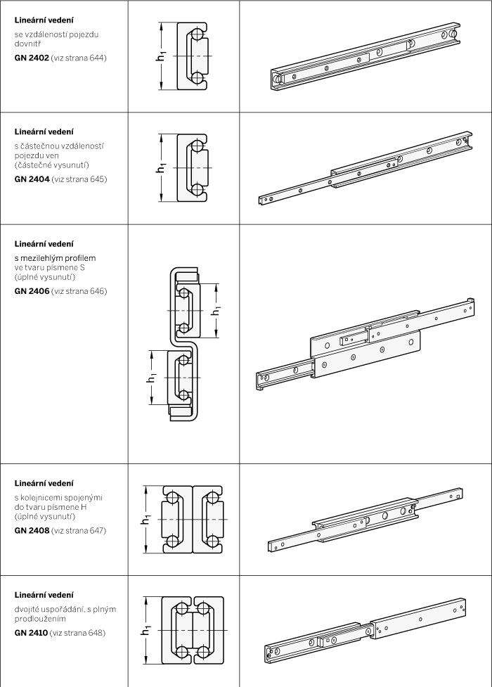 V závislosti na požadavcích jsou k dispozici nejrůznější typy lineárních vedení. Posuv jezdce může probíhat pouze uvnitř délky kolejnice, může dojít k částečnému prodloužení nebo může dojít k plnému prodloužení, které je delší než je vlastní délka kolejnic. Lineární vedení s plným prodloužením se skládají z lineárních vedení vzájemně propojených přes jezdce v kolejnicích nebo pomocí středového profilu.