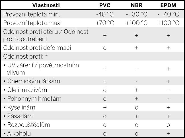 Profily mohou být vyrobené z různých základních materiálů v závislosti na aplikaci. Tabulka shrnuje obecné charakteristiky a vlastnosti pro usnadnění výběru. Vzhledem k množství existujících chemických látek, rozpouštědel atd. není možné provést přesnou charakteristiku. Základní materiály, které jsou v zásadě nestabilní, mohou být odolné v kombinaci s určitými látkami a naopak. Klíčovou roli hraje také koncentrace, teplota a doba působení. Zákazníkovi doporučujeme vyzkoušet odolnost při vzájemném působení příslušných materiálů a látek. * + odolný, o podmíněné odolný, - bez odolnosti