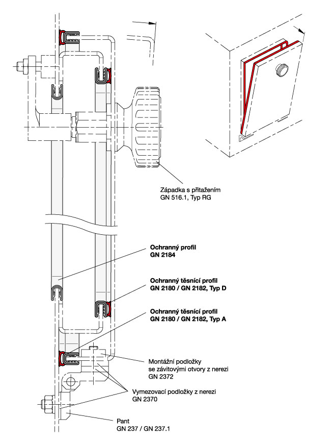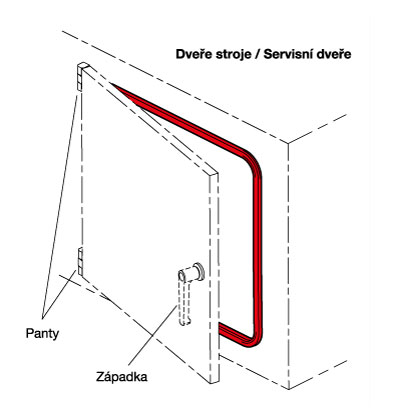 Zobrazená konstrukce znázorňuje standardní použití ochranných profilů a ochranných těsnících profilů na hrany. Těsnící profily jsou připojeny ke dveřím a pevnému rámu. Dveřní otvor je na svém okraji pokrytý ochranným profilem.