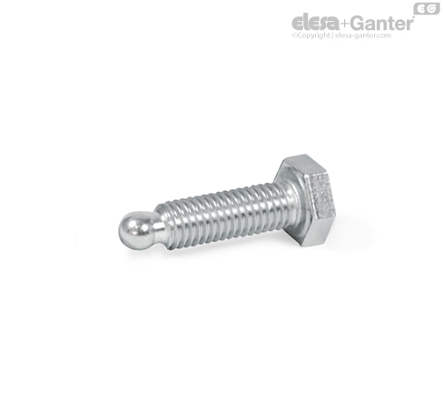 Edelstahl-Sechskantschrauben GN 933.5, Ausführung ZK, haben einen Kugelzapfen dessen Durchmesser d4 kleiner als der Kerndurchmesser d1 des Gewindes ist und eignen sich daher für die Aufnahme von Druckstücken GN 631 / GN 631.5 , die nicht zum Lieferumfang gehören.