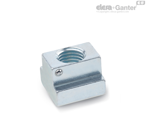 Sie sind jedoch mit einem seitlichen Federelement (Kugel / Druckfeder) versehen. Dadurch wird ein unabsichtliches Verschieben der Mutter in der Nute verhindert, was insbesondere bei senkrechter Anordnung von großem Vorteil ist.
