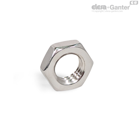 Durch die flache Ausführung sind die Sechskantmuttern optimal auf kürzere Gewinde abgestimmt. Bei der Montage von Rastbolzen schränken sie den Verstellweg nur minimal ein, was insbesondere beim Kontern von zwei Muttern von Bedeutung sein kann.