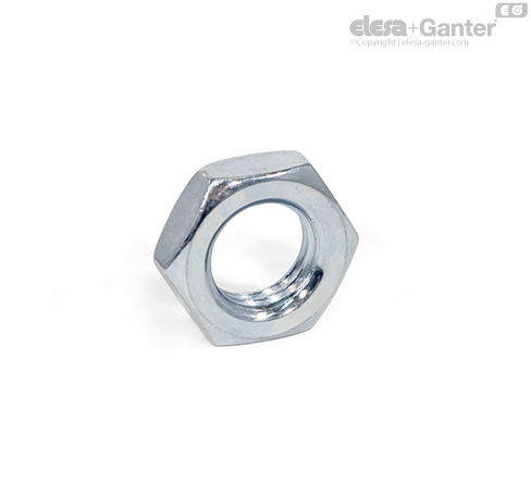 Durch die flache Ausführung sind die Sechskantmuttern optimal auf kürzere Gewinde abgestimmt. Bei der Montage von Rastbolzen schränken sie den Verstellweg nur minimal ein, was insbesondere beim Kontern von zwei Muttern von Bedeutung sein kann.