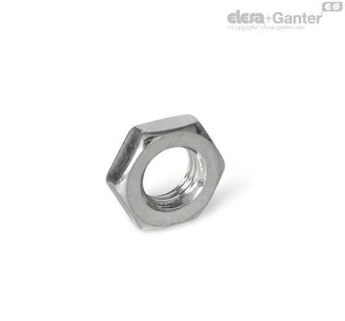 Durch die flache Ausführung sind die Sechskantmuttern optimal auf kürzere Gewinde abgestimmt. Bei der Montage von Rastbolzen schränken sie den Verstellweg nur minimal ein, was insbesondere beim Kontern von zwei Muttern von Bedeutung sein kann.
