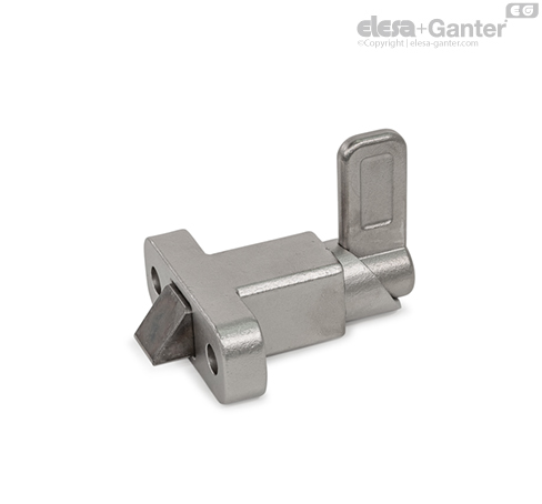 Federriegel GN 724.2 verfügen über einen Raststift mit quadratischem Querschnitt und einer Rastfläche, der eine Anlaufschräge gegenüber liegt. Bei einer Bewegung in Richtung der Anlaufschräge überfährt der Raststift Nuten und Kanten, da dabei der Raststift durch die Anlaufschräge in die Führung bewegt wird. In Richtung der Rastfläche rastet der Raststift entsprechend automatisch ein. Durch Betätigung des Riegels kann die Rastung aufgehoben werden.
