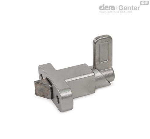 Federriegel GN 724.2 verfügen über einen Raststift mit quadratischem Querschnitt und einer Rastfläche, der eine Anlaufschräge gegenüber liegt. Bei einer Bewegung in Richtung der Anlaufschräge überfährt der Raststift Nuten und Kanten, da dabei der Raststift durch die Anlaufschräge in die Führung bewegt wird. In Richtung der Rastfläche rastet der Raststift entsprechend automatisch ein. Durch Betätigung des Riegels kann die Rastung aufgehoben werden.