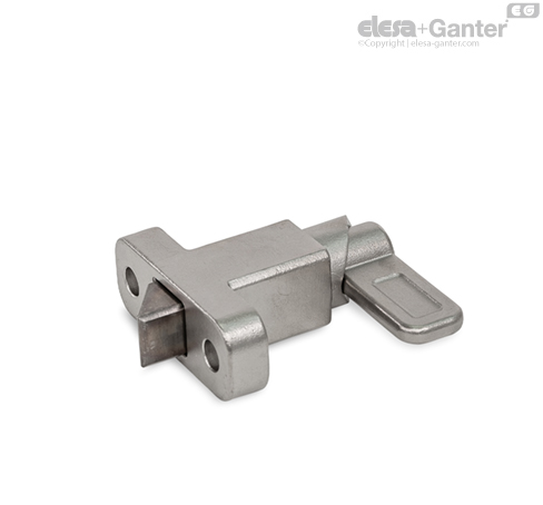 Federriegel GN 724.2 verfügen über einen Raststift mit quadratischem Querschnitt und einer Rastfläche, der eine Anlaufschräge gegenüber liegt. Bei einer Bewegung in Richtung der Anlaufschräge überfährt der Raststift Nuten und Kanten, da dabei der Raststift durch die Anlaufschräge in die Führung bewegt wird. In Richtung der Rastfläche rastet der Raststift entsprechend automatisch ein. Durch Betätigung des Riegels kann die Rastung aufgehoben werden.