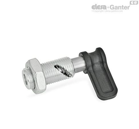 Kurven-Rastriegel GN 712.1 werden eingesetzt, wenn der Raststift zeitweise nicht vorstehen soll. Durch Drehen des Riegels um 90° bzw. 120° im Uhrzeigersinn wird der Raststift über eine Führungskurve ausgefahren. Durch Drehen des Riegels um 90° bzw. 120° im Uhrzeigersinn wird der Raststift über eine Führungskurve ausgefahren.
