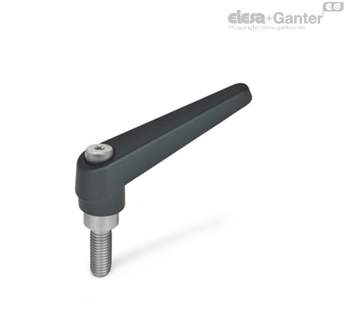 Verstellbare Klemmhebel GN 101.1 sind vorzugsweise dann einzusetzen, wenn der Spannbereich begrenzt oder eine bestimmte Spannstellung erwünscht ist. Der Einsatz ist durch eine Kerbverzahnung mit dem Griff lösbar verbunden.