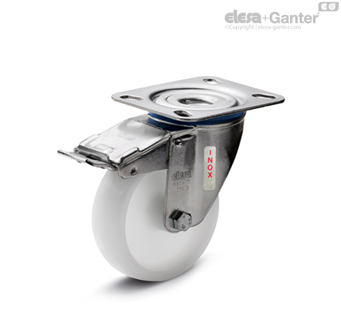 Bremse, sperrt sowohl die Drehung des Rades als auch die des Gehäuses. Die optimalen Abmessungen der Bremse beschränken den Platzbedarf auf ein Minimum und garantieren eine leichte Manövrierbarkeit. Feder Edelstahl.