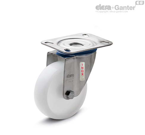 Bremse, sperrt sowohl die Drehung des Rades als auch die des Gehäuses. Die optimalen Abmessungen der Bremse beschränken den Platzbedarf auf ein Minimum und garantieren eine leichte Manövrierbarkeit. Feder Edelstahl.