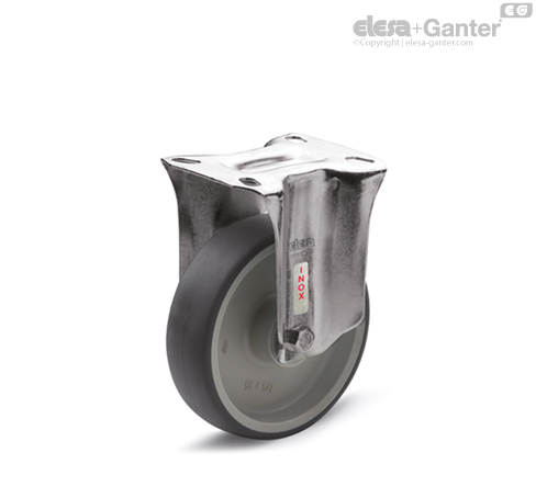 Bremse, sperrt sowohl die Drehung des Rades als auch die des Gehäuses. Die optimalen Abmessungen der Bremse beschränken den Platzbedarf auf ein Minimum und garantieren eine leichte Manövrierbarkeit. Feder aus gehärtetem Stahl oder Edelstahl (SST Ausführung).