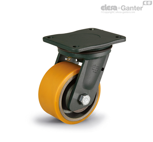 Geeignet für schwere industrielle Anwendungen unter schwierigen Einsatzbedingungen wie Seitenaufprall und hohe Geschwindigkeiten. Das gegossene Polyurethan Rad sorgt für eine hervorragende Gleitfähigkeit und Elastizität, hoher Verschleiß-und Reißfestigkeit. Weitere Informationen siehe RE.F4.