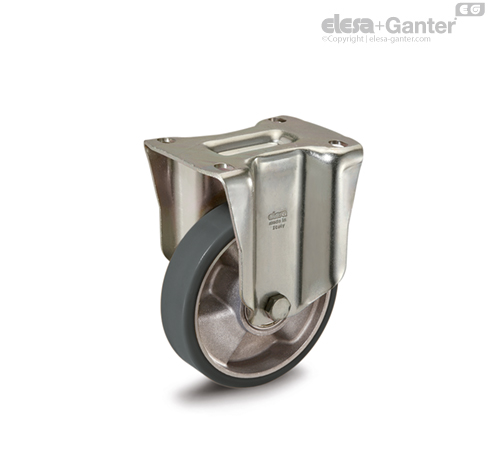 Gelb verzinktes Stahlblech. Die Gehäuse gelten für Lasten bis zu 6800 N. Durch die hohe Tragfähigkeit ist die Rolle für industrielle Schwerlasteinsätze geeignet.