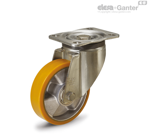 Gelb verzinktes Stahlblech. Das Gehäuse ist für eine Tragfähigkeit bis 7500N ausgelegt. Durch die hohe Tragfähigkeit ist die Rolle für industrielle Schwerlasteinsätze geeignet.