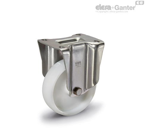 Gelb verzinktes Stahlblech. Das Gehäuse ist für eine Tragfähigkeit bis 7300N ausgelegt. Durch die hohe Tragfähigkeit ist die Rolle für industrielle Schwerlasteinsätze geeignet.