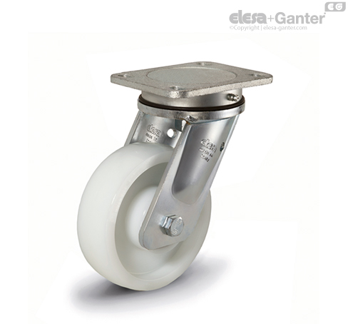 Verzinktes, Stahlblechgehäuse. Die Präsenz eines Axiallager und eines konischen Lagers gewährleisten ausgezeichnete Manövrierbarkeit und ein ganz geringes Spiel. Ausgestattet mit einer Schmiervorrichtung und der Sicherungsmutter. Das Gehäuse ist für eine Tragfähigkeit bis zu 9000N ausgelegt. Geeignet für schwere industrielle Anwendungen und schwere Einsatzbedingungen, wie Seitenaufprall und hohe Geschwindigkeiten.