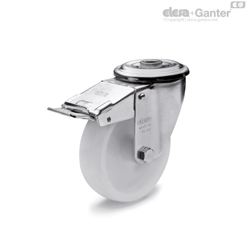 Bremse, sperrt sowohl die Drehung des Rades als auch die des Gehäuses. Die optimalen Abmessungen der Bremse beschränken den Platzbedarf auf ein Minimum und garantieren eine leichte Manövrierbarkeit. Feder aus gehärtetem Stahl.