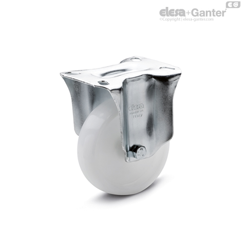 Bremse, sperrt sowohl die Drehung des Rades als auch die des Gehäuses. Die optimalen Abmessungen der Bremse beschränken den Platzbedarf auf ein Minimum und garantieren eine leichte Manövrierbarkeit. Feder aus gehärtetem Stahl.