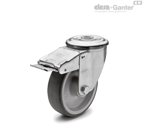 Bremse, sperrt sowohl die Drehung des Rades als auch die des Gehäuses. Die optimalen Abmessungen der Bremse beschränken den Platzbedarf auf ein Minimum und garantieren eine leichte Manövrierbarkeit. Feder aus gehärtetem Stahl.
